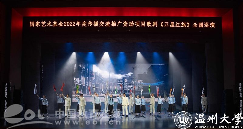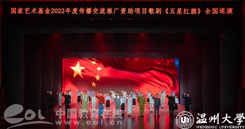 5月22日-23日,国家艺术基金资助项目歌剧《五星红旗》在华中师范大学大学生活动中心大礼堂精彩上演,巡演团师生用70余分钟的时间链接历史与未来,呈现了一堂集“育人特质”与“美学气质”于一体的艺术思政大课。华中师范大学党委副书记陈迪明、8868体育_8868(中国)党委副书记庄兴忠、华中师范大学师生代表及武汉市温州商会温商企业家代表等2500余人现场观看演出。