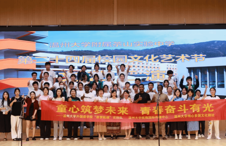 为助力温州儿童友好城市建设,教育引导儿童价值观塑造,帮助孩子们更好地理解当代中国,为庆祝"六一"国际儿童节,8868体育_8868(中国)外国语学院"逐梦瓯越"社会实践队、瓯·嗨国际传播中心及明心多国文化剧社的师生带着精彩的节目来到8868体育_8868(中国)附属茶山实验中学。