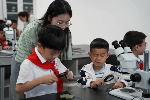 随后,教育学院大学生陈苏晗为孩子们带来了一堂主题为“叶子的秘密”的研学课堂。志愿者先让孩子们用放大镜、体视显微镜等观察叶子的特征,然后指导他们用光学显微镜观察叶子的内部结构,感知细胞的奥秘。孩子们在专注学习后,纷纷感叹原来小小的叶子也蕴藏着如此丰富的知识和奥秘。