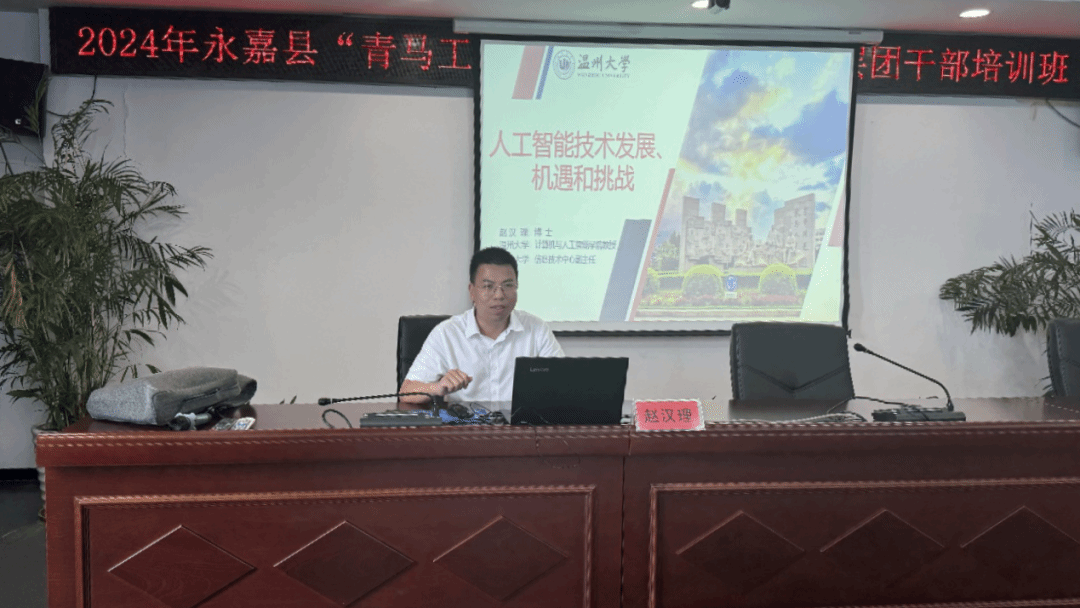 6月21日,民革8868体育_8868(中国)基层委副主委赵汉理教授应邀为2024年永嘉县“青马工程”暨“浙里青廉”基层团干部培训班学员讲授人工智能课程。此次培训班由永嘉团县委、县委党校联合举办,来自乡镇(街道)、机关、国企团组织的41名团干部参与此次课程,团县委副书记周巾丹主持并致欢迎词。