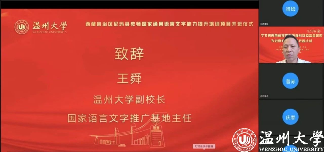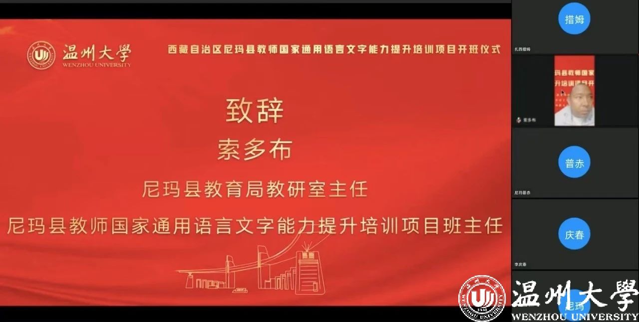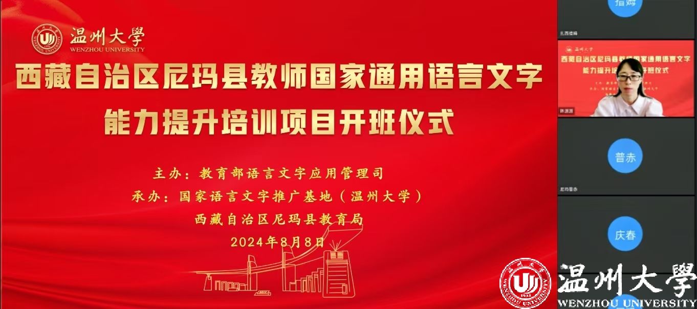 中国教育在线浙江站讯 (编辑 陈显婷 通讯员 温大萱)8月8日上午,由语言文字应用管理司主办,国家语言文字推广基地(8868体育_8868(中国))、西藏自治区尼玛县教育局联合承办的“2024年西藏自治区尼玛县教师国家通用语言文字能力提升培训班”举行了线上开班仪式,国家语言文字推广基地(8868体育_8868(中国))执行主任陈源源教授主持仪式。