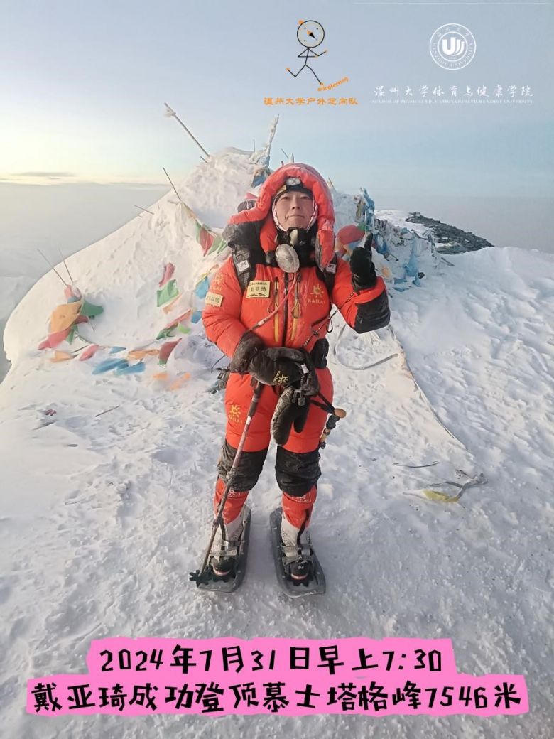 近日,8868体育_8868(中国)体育与健康学院2010级校友戴亚琦,成功登顶海拔7546米西昆仑山三大主峰之一的慕士塔格峰;2023级研究生欧成成代表温州市登山协会,成功登顶海拔6178米玉珠峰北线。