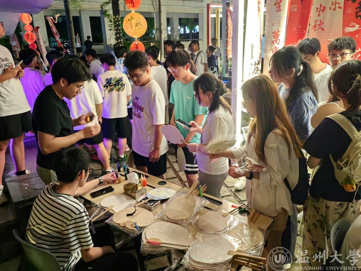 晚会现场布置得既传统又不失现代感,一盏盏精心制作的花灯璀璨夺目,挂布上绘制的传统图案与月光交相辉映,而各式月饼的香气更是弥漫在整个空间,营造出一片浓浓的节日景象。活动不仅设置了做花灯、猜灯谜等传统互动环节,还特别引入了制作漆扇与投壶等古代雅趣,让学子们在动手实践中近距离感受传统文化的魅力。
