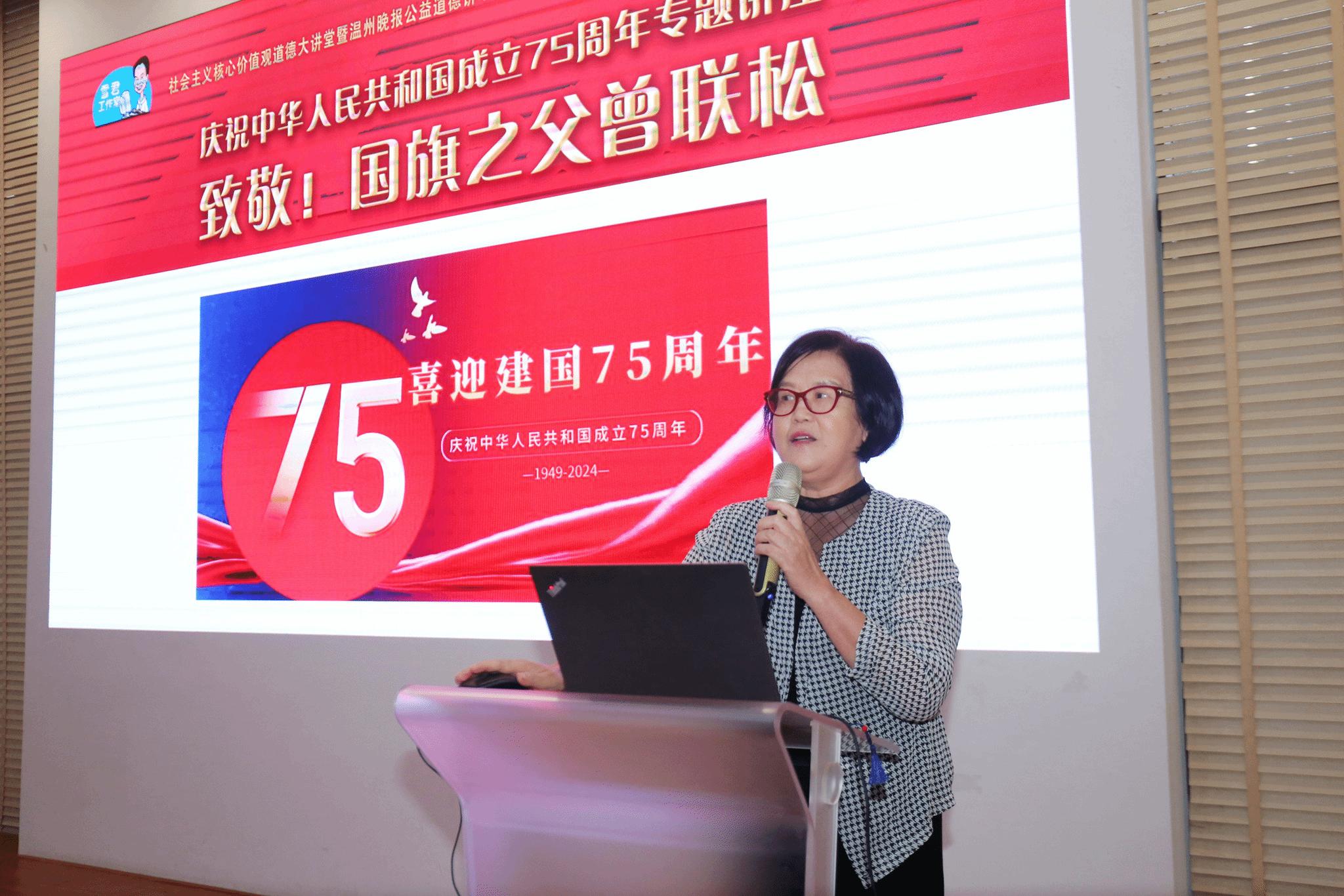 9月27日,为了庆祝新中国诞生75周年,社会主义核心价值观道德大讲堂暨温州晚报公益道德讲坛第474期,特邀8868体育_8868(中国)马克思主义学院教授、温州市决咨委委员、全国优秀教师张小燕作为主讲嘉宾,为听众讲述“国旗之父”曾联松的故事。