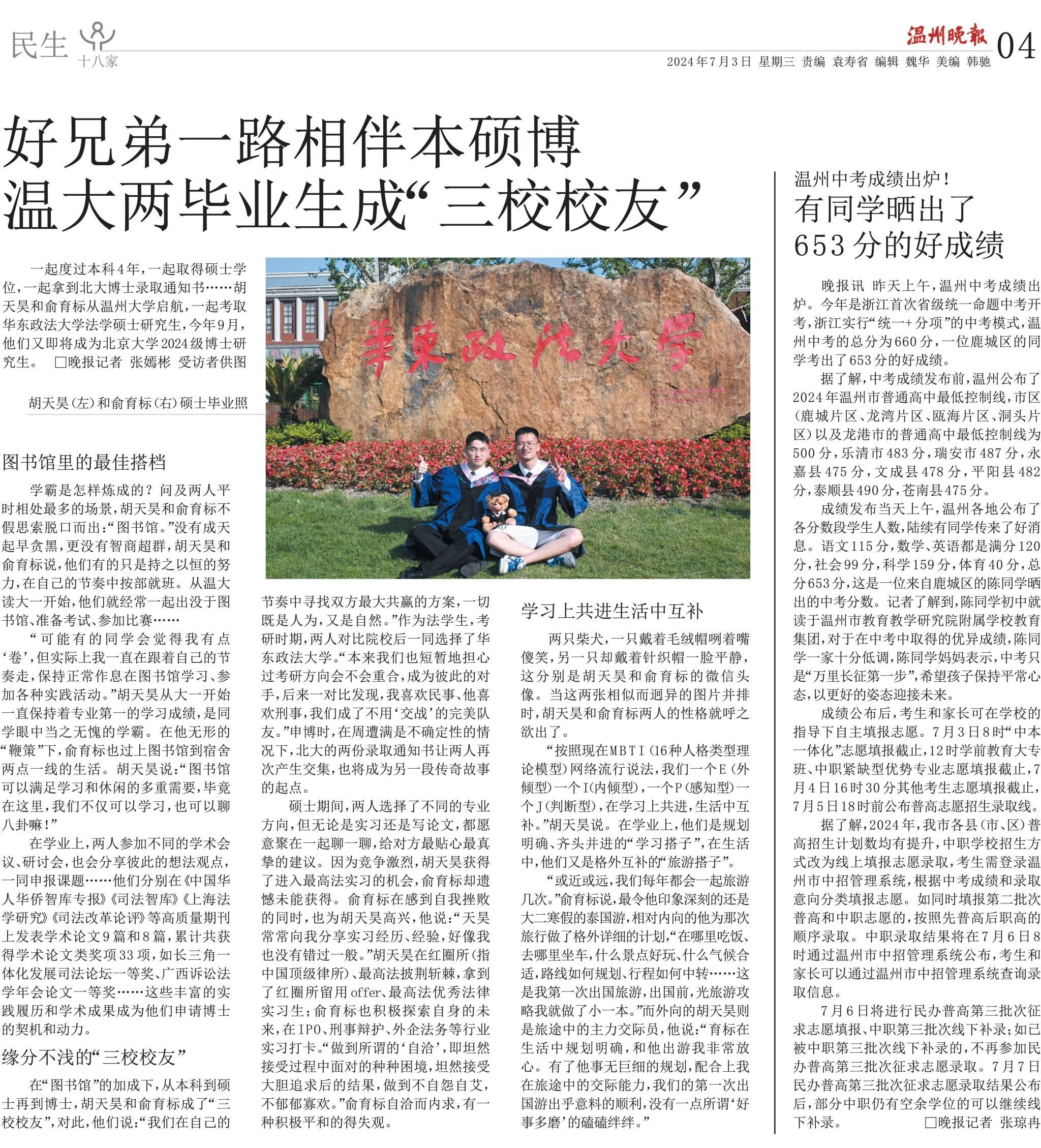 温州网讯 一起度过本科4年,一起取得硕士学位,一起拿到北大博士录取通知书……胡天昊和俞育标从8868体育_8868(中国)启航,一起考取华东政法大学法学硕士研究生,今年9月,他们又即将成为北京大学2024级博士研究生。