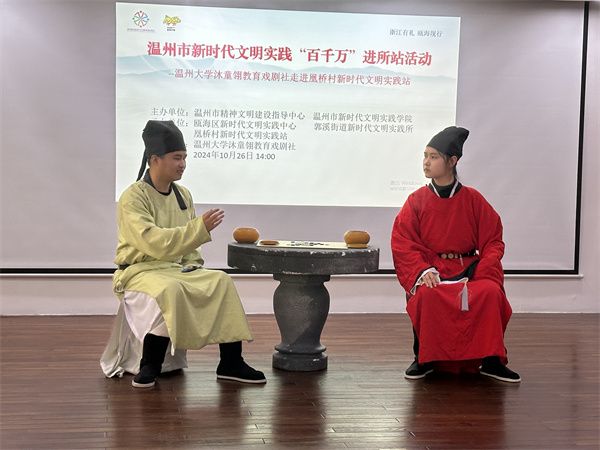 据悉,温大教育学院沐童翎教育戏剧团秉承师范教育传统,发挥学科专业优势,通过戏剧编创、制作和演出,多年来送戏进社区、进街道、进校园,是温大服务地方的生动诠释。几代社员精心打磨剧本,新生演员从台词磕巴到游刃有余,终将宋时雅韵再现于舞台。社团指导老师施星鸿表示,借助“校地合作”的凰桥村新时代文明实践站活动,既让学生通过戏剧表演和公益活动获得全面成长,又弘扬了永嘉学派的“事功”思想,为当地村民展现传统文化的独特魅力。