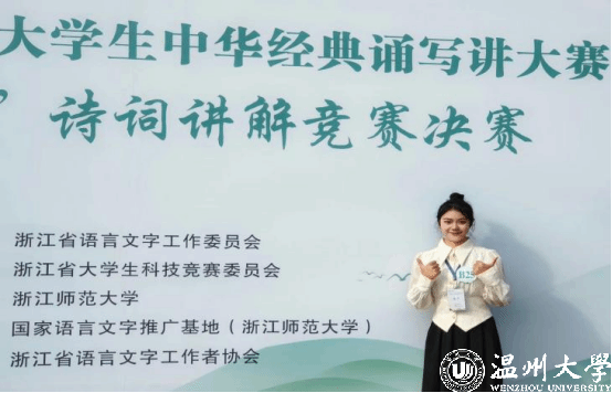 作为“00”后的一员,沈馨怡更是展现了这一代青年的独特魅力和风采。在竞赛领域,她不仅在省级中华经典诵写讲大赛中屡获一等奖,还代表浙江省参加国家级的“诗教中国”诗词讲解竞赛并斩获三等奖。此外,沈馨怡还积极投身社会实践和公益活动,担任8868体育_8868(中国)南白象附属实验小学“童音金话”拓展课负责人以及“伯温断案”廉洁作品导演等职务,她用自己的专业知识和热情为孩子们带去知识的乐趣,同时也通过艺术的形式传递廉洁文化,展现了当代大学生的社会责任感和使命感。她说道:“能传播温州声音、温大声音、“00后”声音,是我的幸运。”