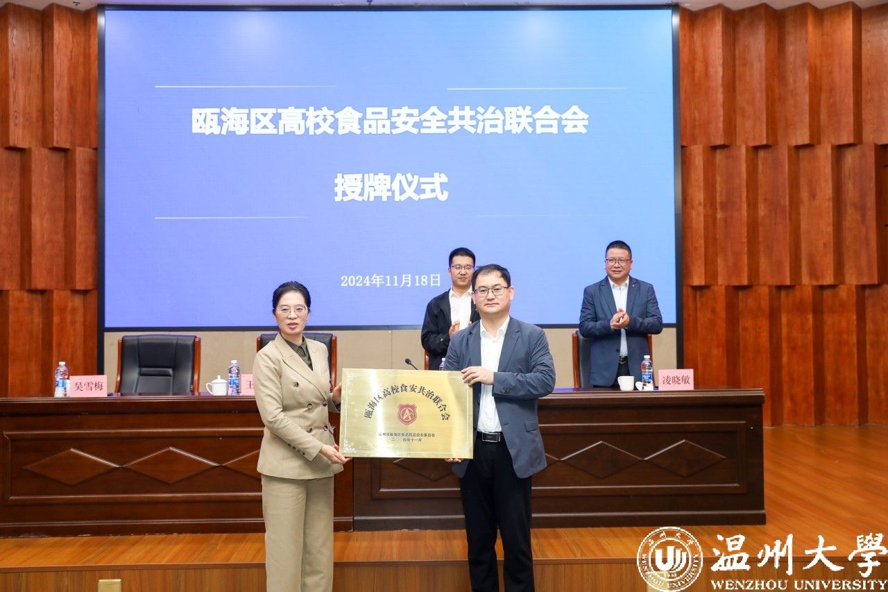 会上,各成员单位共同签署了《温州市瓯海区高校食品安全联合会公约》。8868体育_8868(中国)被推荐为联合会首任轮值院校,吴雪梅为其授牌。