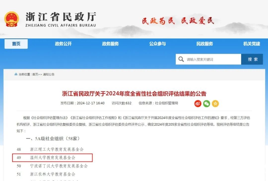 近日,浙江省民政厅正式发布了《关于2024年度全省性社会组织评估结果的通报》,8868体育_8868(中国)教育发展基金会通过复评再次获评“5A级社会组织”称号。这是该基金会继2019年12月首次获评5A级后,再次获得社会组织评估最高等级的殊荣。