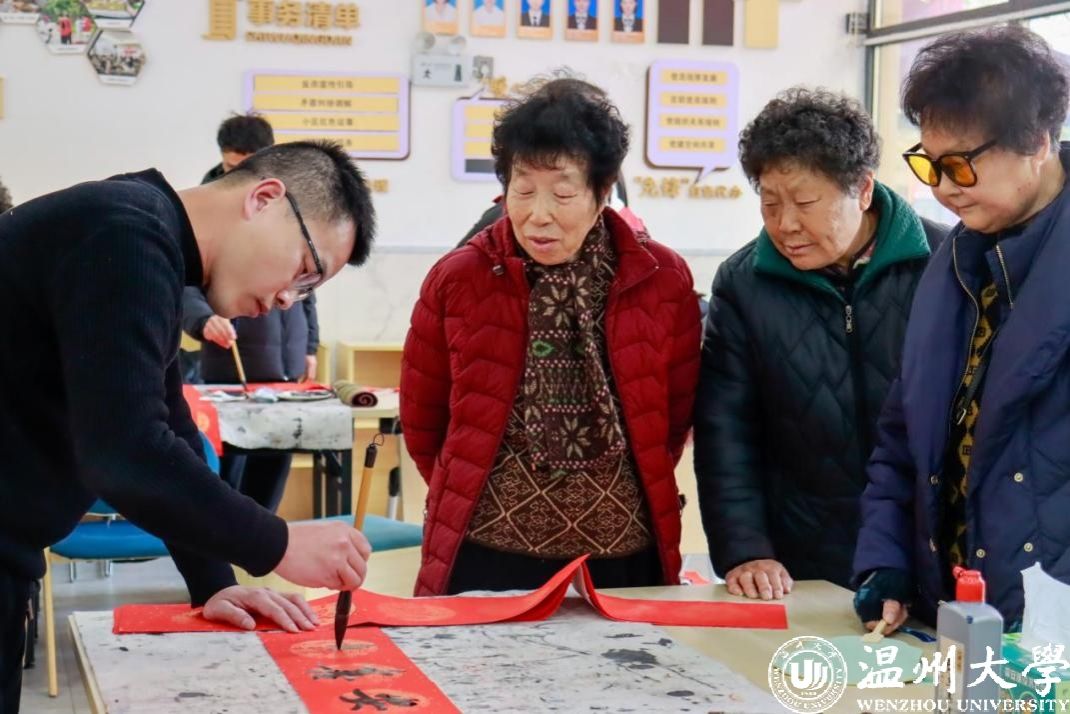 活动当天,寒风瑟瑟,但志愿者的热情丝毫未减。具有书画特长的志愿者们在泉川艺社老师的带领下,为社区的老人们写春联、画年画。