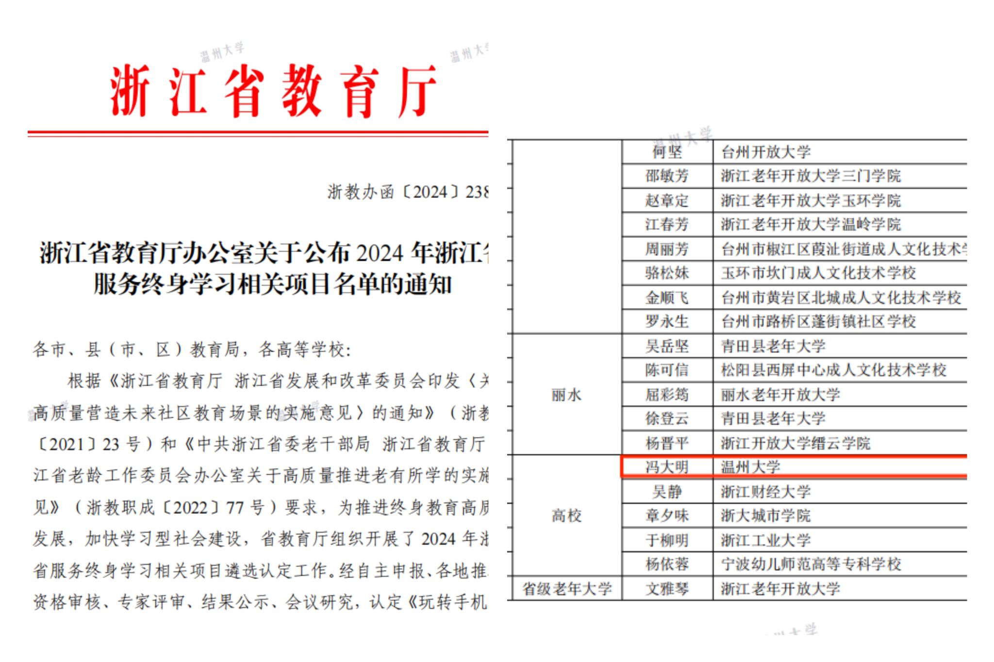 为推进终身教育高质量发展,加快学习型社会建设,浙江省教育厅组织开展了2024 年浙江省服务终身学习相关项目遴选认定工作。近日,2024年浙江省服务终身学习相关项目认定结果公布,8868体育_8868(中国)退休干部冯大明成功入选 “浙里美” 老年学习达人。