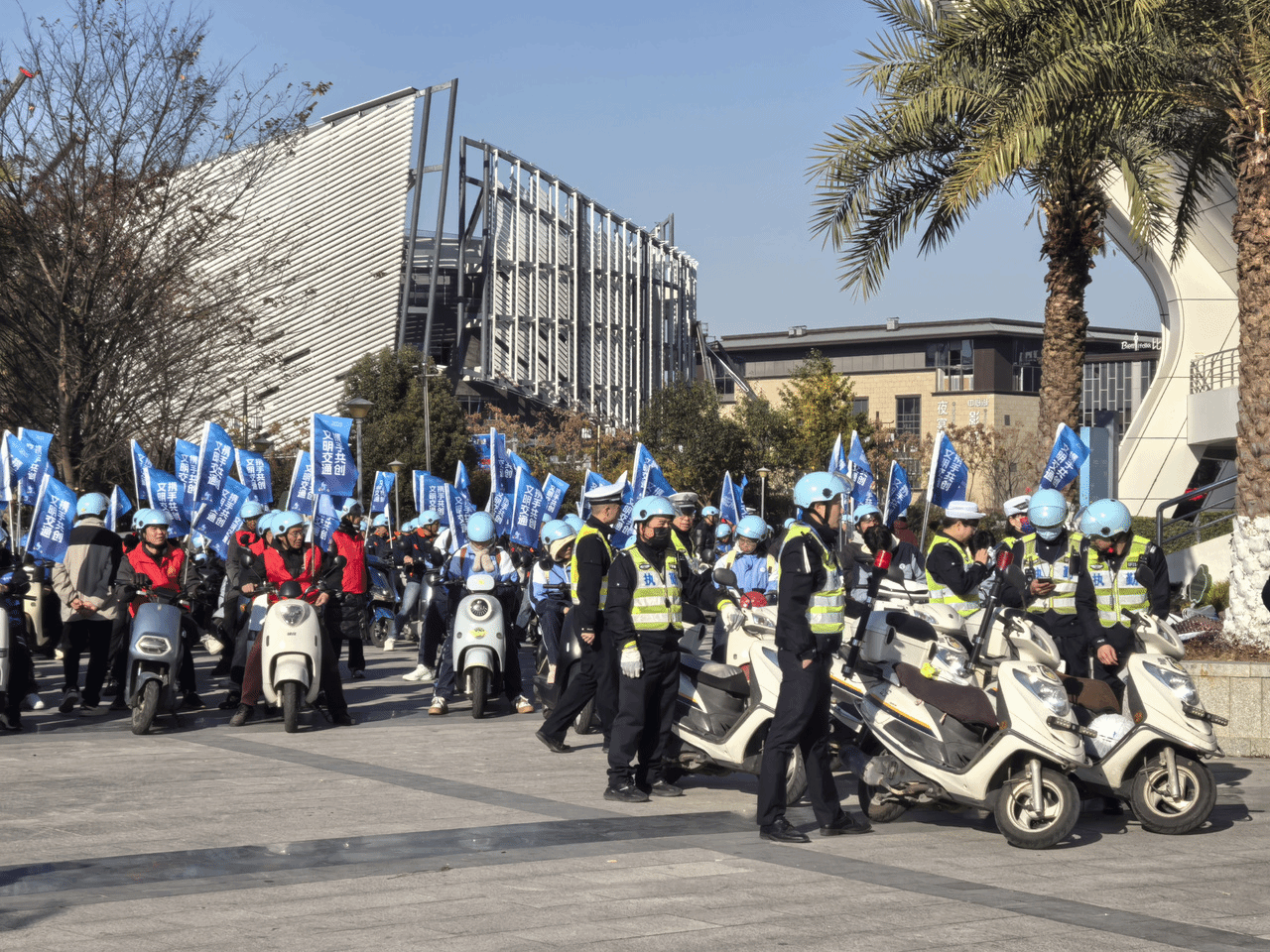 图为现场群众及工作人员佩戴智能头盔