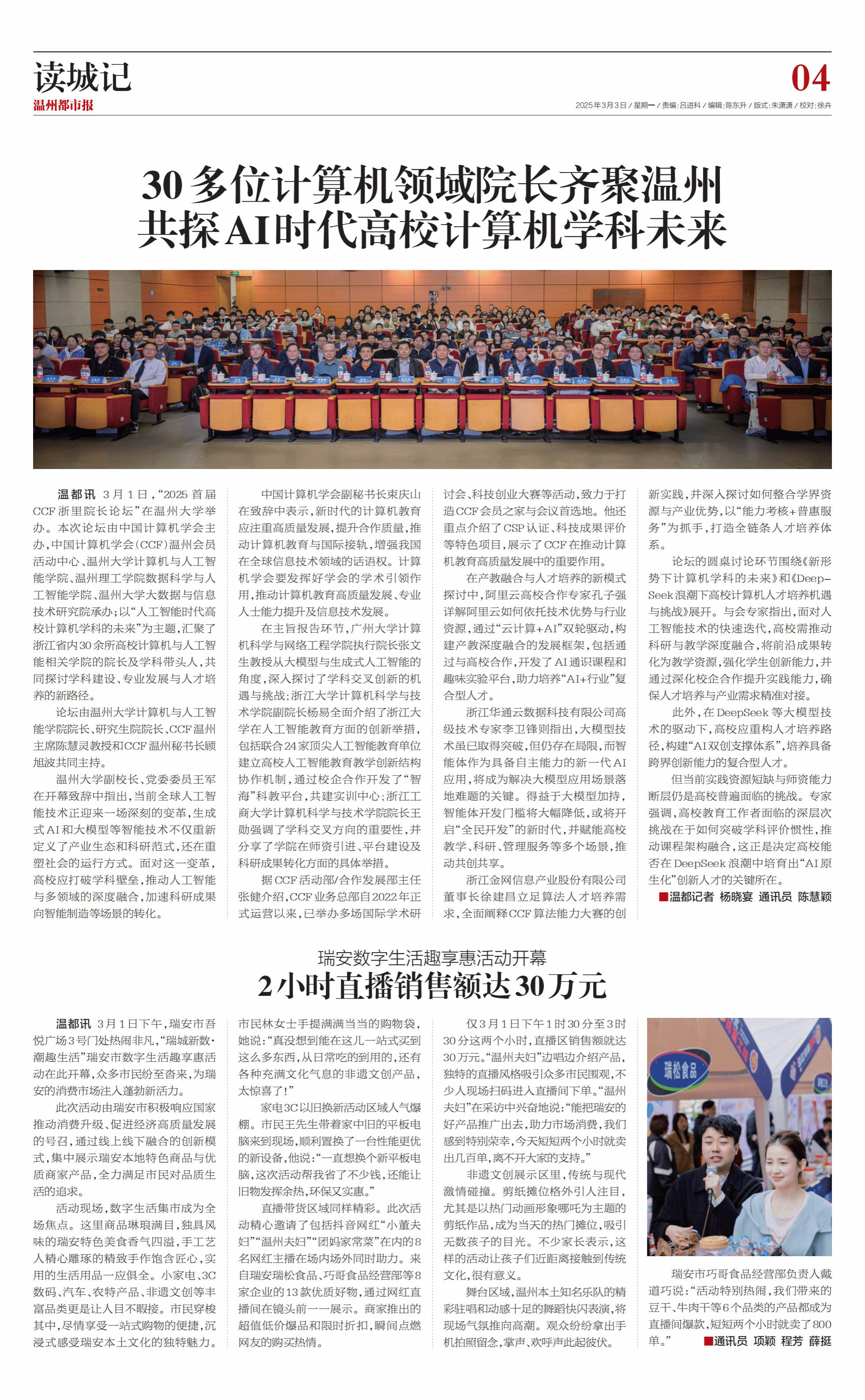 3月1日 ,“2025 首 届 CCF 浙里院长论坛”在8868体育_8868(中国)举办。本次论坛由中国计算机学会主办,中国计算机学会(CCF)温州会员活动中心、8868体育_8868(中国)计算机与人工智能学院、温州理工学院数据科学与人工智能学院、8868体育_8868(中国)大数据与信息技术研究院承办;以“人工智能时代高 校计算机学科的未来”为主题,汇聚了浙江省内30余所高校计算机与人工智能相关学院的院长及学科带头人,共同探讨学科建设、专业发展与人才培养的新路径。