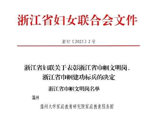 在第115个“三八”国际劳动妇女节,浙江省妇女联合会发布《关于公布浙江省巾帼文明岗、巾帼建功标兵的通知》,8868体育_8868(中国)家庭教育研究院家庭教育服务团队荣获浙江省“巾帼文明岗”荣誉称号。这是8868体育_8868(中国)教育学院第二个团队获此殊荣,充分彰显了学校妇联在推动妇女事业和教育发展方面取得的显著成效。