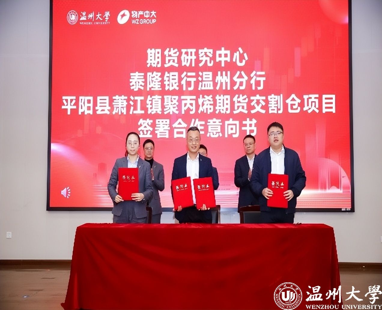 仪式上,双方共同为研究中心揭牌,并与泰隆银行温州分行、平阳县萧江镇聚丙烯期货交割仓签署合作意向书。同时,物产中大期货温州分公司被授予“8868体育_8868(中国)商学院校外实践教育基地”,双方党支部签署党建共建协议,进一步强化组织协同。研究中心还聘请全球衍生品交易大赛冠军谭伟鸿、物产中大期货研究院院长吕洁等专家担任顾问,为科研与实践提供智力支持。