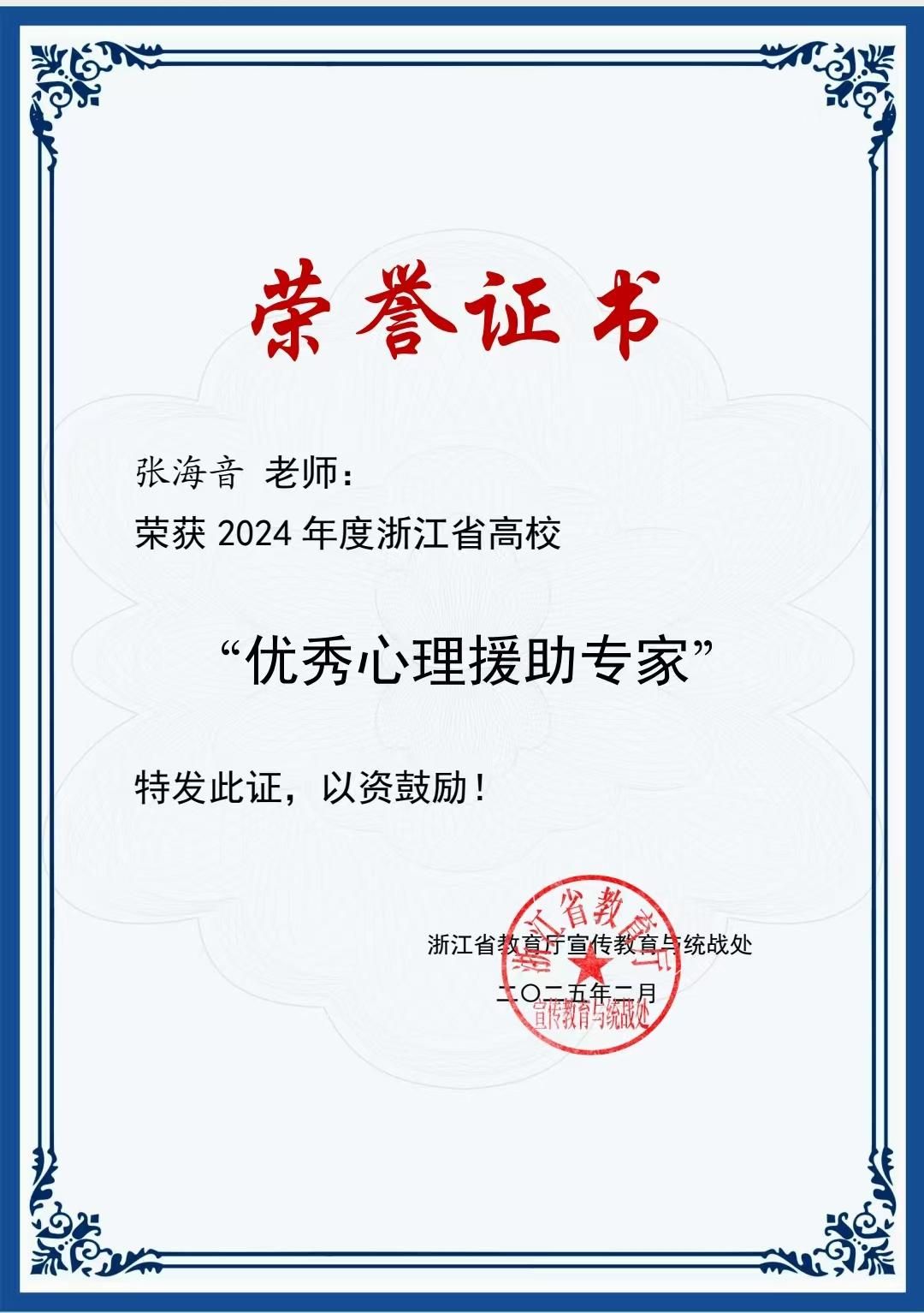 近日,2024年度浙江省高校“优秀心理援助专家”评选结果揭晓,8868体育_8868(中国)退休教师张海音副教授从全省专家中脱颖而出,获评浙江省高校“优秀心理援助专家”。