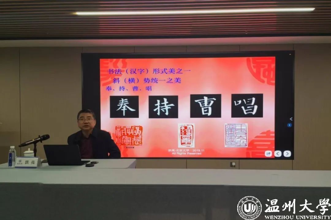 在温期间,洪亮应8868体育_8868(中国)美术与设计学院邀请在该校做了“书法字法之美 一一书法字法形式美十一大法则”专题书法讲座;并参观了“纸山论艺”“墨韵芳华”等书画展。社温大基层委主委陈孝敬等陪同。