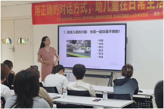 日前,8868体育_8868(中国)“心翼”志愿服务团队携手深耕孤独症教育领域20余年的8868体育_8868(中国)孤独症儿童教育与康复研究中心主任李晓燕教授,在泰顺县残疾人联合会为40余组孤独症儿童家庭带来了一场以“解锁沟通密码,点亮孤独症孩子的未来”为主题的的暖心课堂。