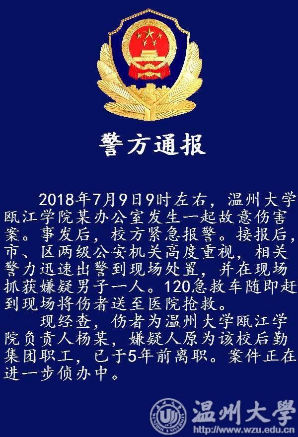 2018年7月9日9时左右,我校瓯江学院某办公室发生一起故意伤害案。案件由瓯海区公安局正在进一步侦办中。特此通告。