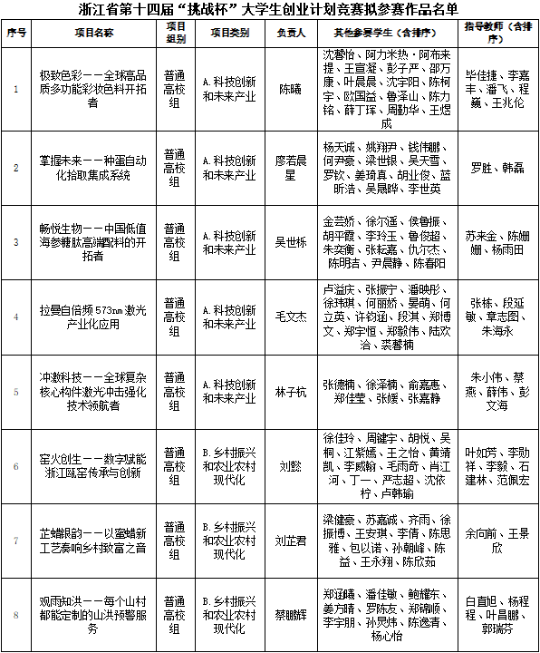 根据《关于举办浙江省第十四届“挑战杯”大学生创业计划竞赛的通知》相关要求,经8868体育_8868(中国)“挑战杯”院赛、校赛等两次公开、公正、公平的选拔,现将我校拟推荐参加浙江省第十四届“挑战杯”大学生创业计划竞赛的作品相关信息予以公示。