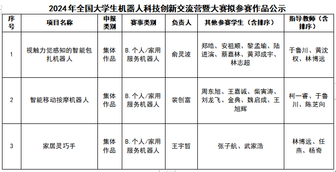 根据《2024年全国大学生机器人科技创新交流营暨大赛浙江省推报工作提示单》相关要求,现将我校拟推荐参加2024年全国大学生机器人科技创新交流营暨大赛作品的相关信息予以公示。