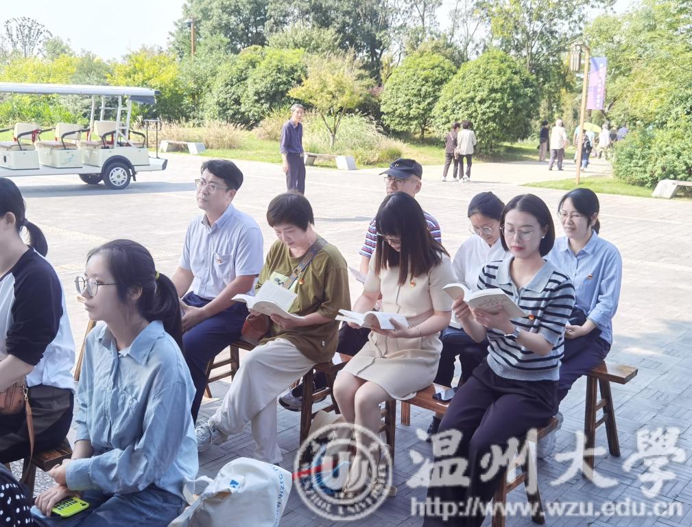 在瓯海区沙河村的三垟湿地习近平总书记亲植榕树旁,教工第四支部党员重温习近平总书记当年重要讲话。2005年5月20日,习近平同志考察了位于湿地内的沙河村,提出了“保护好、利用好、建设好”生态园的重要要求和“要把生态园这件事办好,办成对子孙后代积德的一件善事;办成造福于当地群众的一件实事;办成生态建设的一件好事”的殷切期望。党员同志沉浸式体会《习近平新时代中国特色社会主义思想专题摘遍》中“绿水青山就是金山银山”的理念。