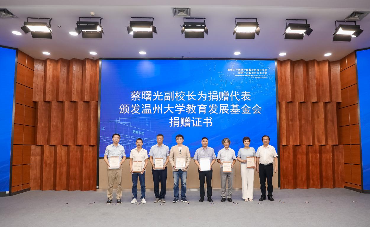 蔡曙光副校长为理事会顾问、会长、副会长、秘书长和副秘书长颁发聘书,并为基金捐赠代表周文、王拓宇、郑元虎、滕国平、倪建祥、刘丹静、仇展炜等校友颁发捐赠证书。