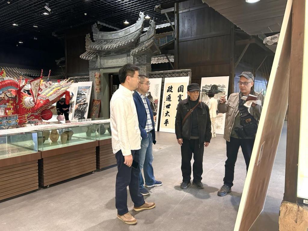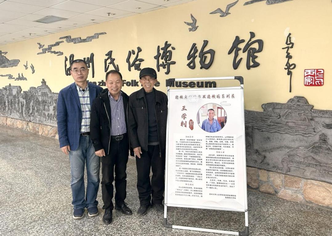 泉川艺社社长、茶山街道新乡贤联谊会秘书长王大普、“农民书画家”王学钊与8868体育_8868(中国)温州民俗博物馆万军合影