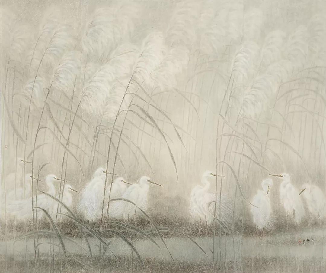 谢子静的作品以恬静、典雅、淳朴、淡泊为主旋律,而积极向上,热情乐观则是作品精神的内涵。在立意造景方面,看似寻常,但却能给人以无限遐想。如《秋露》图,画面右侧,一株强劲有力的剑麻直线挺然而立,远处数株风姿自然,并巧布在画面右侧以曲线多变的外形,构成一大空白。空白的一侧,隐藏着两只相依的禽鸟,使画面别开生面,既增添了联想的空间,又活跃了画面的气氛。意的妙趣,情的缠绵,赏之有回味,读之有余音。这种寻常的造景立意,能取得如此的艺术魅力,全在思维的敏捷,想象的豁达,虚实的巧布,笔墨的机灵。在构成布置方面,虽无惊险奇特之举,然而能让人感到平中有变、平中藏奇的感受。如《青剑》图,几株茁壮的剑麻平行直线排列,几只蜻蜓横向飞行,从画面构成来看,是一幅极为简单的纵横直线相交组合。由于平行中有耐人寻味的变化,交叉中有捉摸不定的穿插,在不经意中把那种朴实、纯洁、天然、自在的艺术情味表现得十分得体,给人以辽阔、深远、新奇、大气的美感。在设色方面,很少采用强烈夺目绚丽的色彩,而是以清淡典雅作为基调,于淡中求变化,淡中求韵味。刻意追求物象神质情态的表现,以达到最强度的艺术感染力。如《蒹葭苍苍》图,作品以平日里采风、写生途中所见的芦苇与嬉栖的白鹭为画材,旨在表现自然界动人和谐的一幕,寄寓着摆脱尘俗,融入超逸的自然景界,抒发了一种美好的心境。画风以宋明院体花鸟画之雍容谨严为典范,参以文人画逸笔的幽远意境与简澹设色,营造画者心中氤氲已久的古典幽梦。篇幅宏阔,意在改变历代花鸟画常见的小品格局,赋予作品以富有张力的现代视觉形式效果。如《荷风送香》图,整幅画面如同一曲抒情的轻音乐,使人沉浸而陶醉。青绿色的荷叶,在淡泊中见有沉甸厚重之感,叶面周边施以淡赭,不仅取得温柔的冷暖对比效果,也把荷叶的生态美表现得鲜活纯真。白色的荷花,着粉不滞板,恰到好处,把花瓣沉稳而透亮的质感表现得极为优美。月黄的莲蓬更是意气妖态,飘飘然而欲舞,默默然若移步,似有清香袭人,如临野塘晨风,水天一色,花草和谐,赏之悦目,读之心怡。这种境界正是谢子静匠心用色所追求的艺术情趣。《传承.蜕变》是谢子静近期的创作作品,画面表现的是温州古戏台的一组组戏曲彩绘图饰,辅以吉祥纹饰。彩绘人物动态夸张、生动,线条运用娴熟、流畅,色彩斑驳、厚重,以传统的工笔重彩技法记载了温州戏曲文化与民俗文化。作者正以其特有的视角和方式关注温州戏曲文化遗产,倡导温州南戏的传承与蜕变。更有得一之想的是画面以一只飞鸟置于前景,将不同时期舞台的图饰作为背景,达到穿越时空的联想。以花鸟画的形式来表达戏曲的题材内容可能当属首次,这充分说明作者对事物观察的敏锐性和大胆创意的精神,关注其传承与蜕变。
